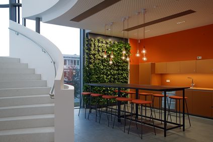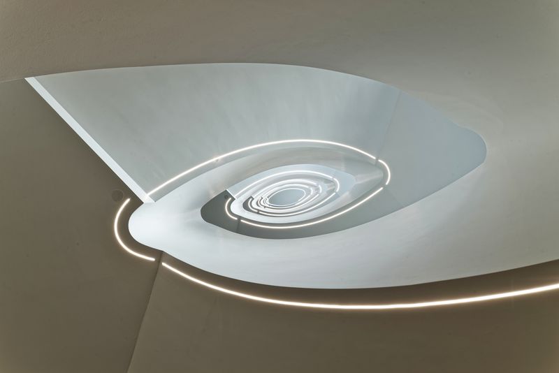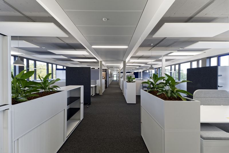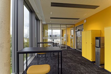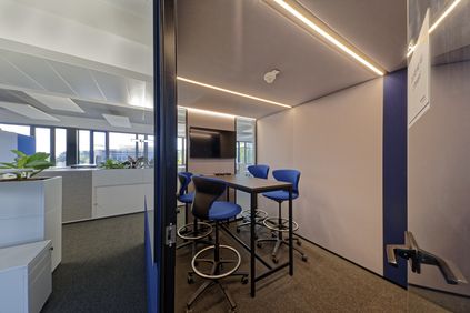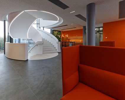 Der Hauptzugang erfolgt über eine großzügig verglaste, zentrale Erschliessungsfläche. Blickfang hier sind eine skulpturale, ellipsenförmige Treppe und ansprechend gestaltete Besprechungszonen, welche zu kreativen Denkprozessen anregen.