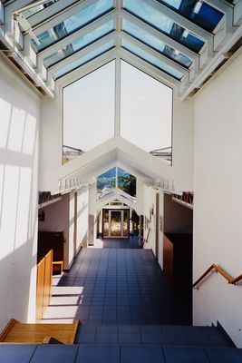 Die zentrale, verglaste Erschließungsachse wird links und rechts von den einzelnen Pavillons begrenzt.