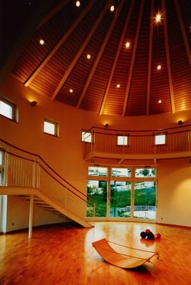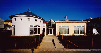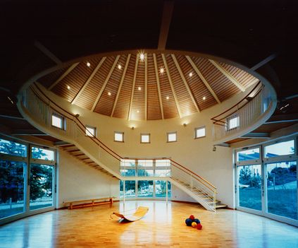 Durch große über Eck angeordnete Schiebetüren ist ein nahtloser Übergang zwischen Innen- und Außenspielbereich möglich.