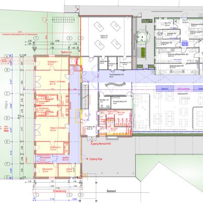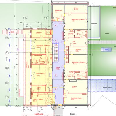 Dazu wird der Pavillon 2 der Bärenfelsschule umgenutzt, saniert und im Obergeschoss umgebaut. Angrenzend daran wird die Fläche für die Kindertagesstätte (KiTa) mit einem Anbau ergänzt. Daran schließt sich die Außenspielfläche in ausreichender Größe an.