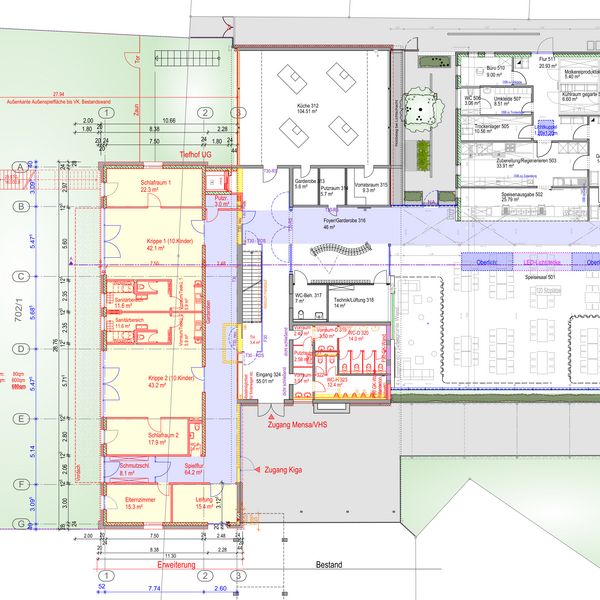 Zusätzlich liegt dort ein Mehrzweckraum, ein Materialraum und ein Personalraum.