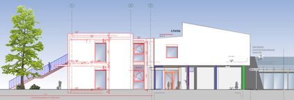Der Anbau wird zweigeschossig in Stahlbeton errichtet, Innenwände werden als Trockenbaukonstruktion erstellt. Das Gebäude erhält ein Flachdach in versetzten Ebenen.