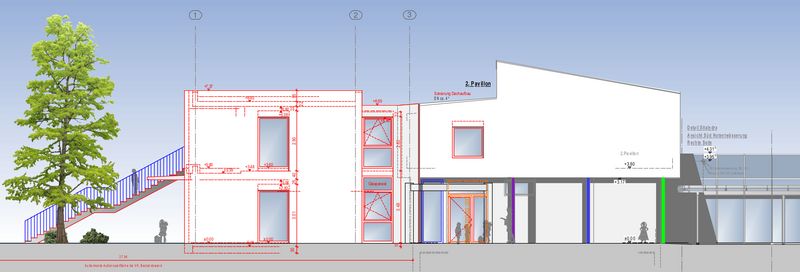 Direkt anschließend an den vorbeschriebenen Pavillon 2 wird die Fläche mit einem neuen Anbau Richtung Westen erweitert.