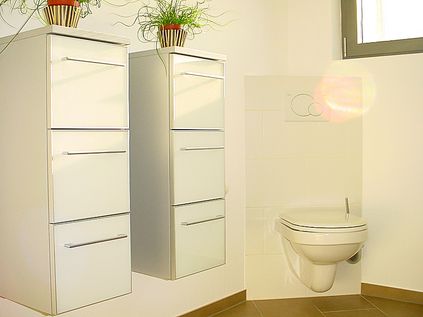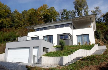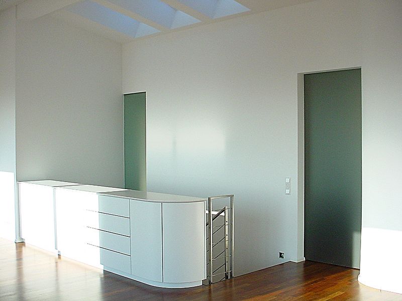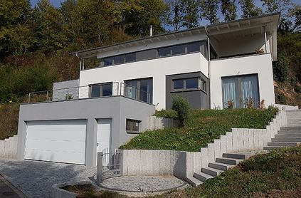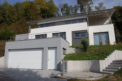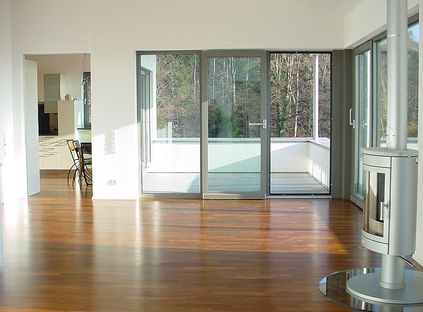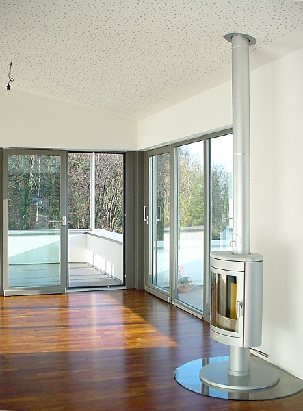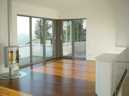 Die zwei obereren Geschosse beherbergen die Wohnräume. Durch die großzügigen Südverglasungen hat man von sämtlichen Wohnräumen eine hervorragende Aussicht über ganz Grenzach-Wyhlen bis in die Schweiz.