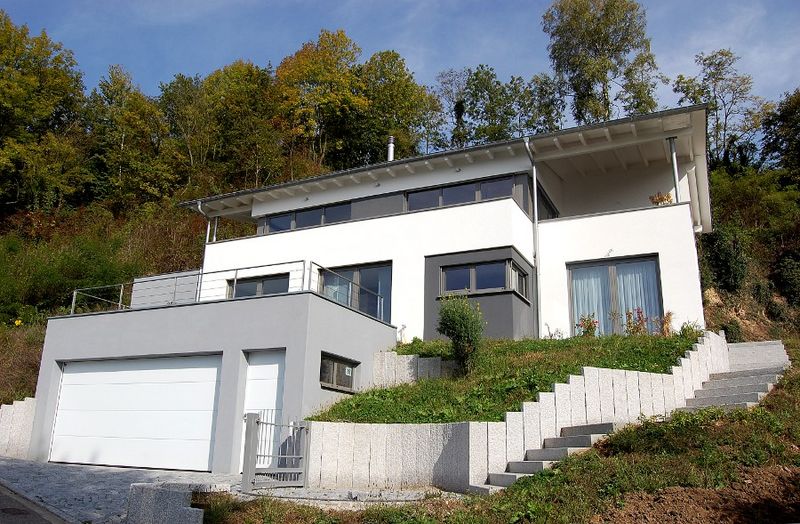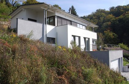 Durch die terrassenartige Ausbildung des Baukörpers und die Gliederung mit Vor- und Rücksprüngen entstehen interessante räumliche Zusammenhänge.
