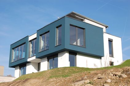Das Gebäude zeigt sich in einer modernen Formensprache, geprägt durch kubische Formen und Flachdächer.